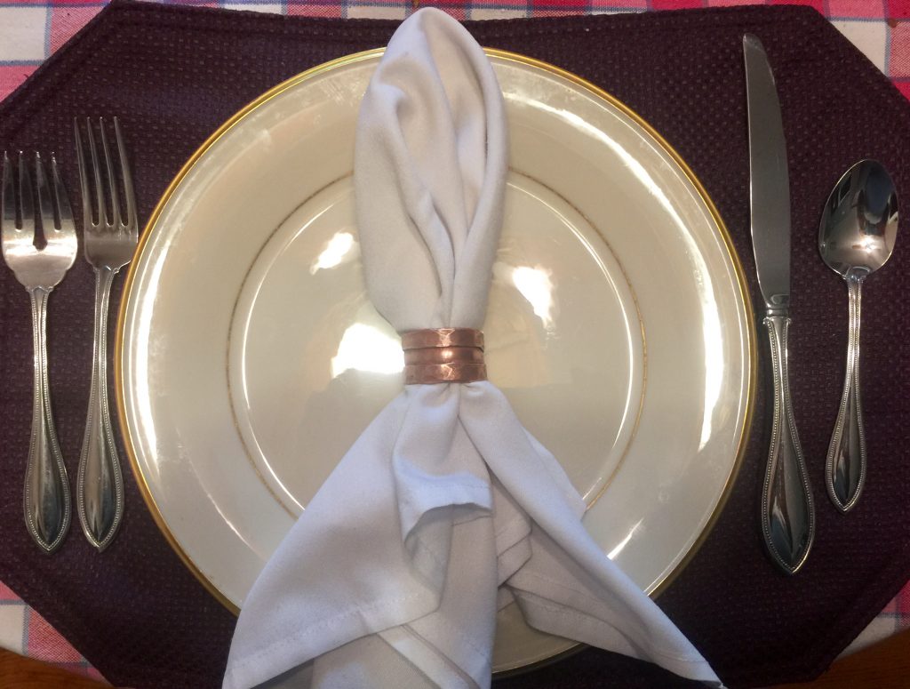 I was tinkering around the other day trying to come up with a gift for my girlfriend and ended up making a cool looking napkin ring. Hand forged and pounded copper ring. Custom made to order in sets of 4, 8, & 12. Thinking of them as a gift I can stamp dates and initials on the inside for that perfect personal gift that is worthy to handed down through the generations. E-mail me today for pricing and production time.
